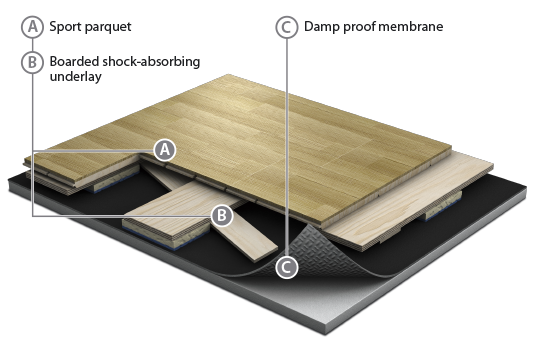 Gornji deo sistema je troslojni sportski parket struktuiran tako da obezbedjuje izvrsnu stabilnost. Specijalno sastavljeni visokoabrazivni sportski lak nanesen u 9 slojeva pruza optimalnu ravnotezu svojstava klizanja neophodnih za timske sportove.